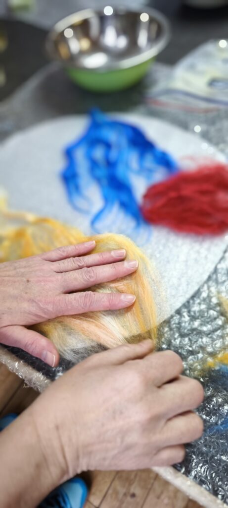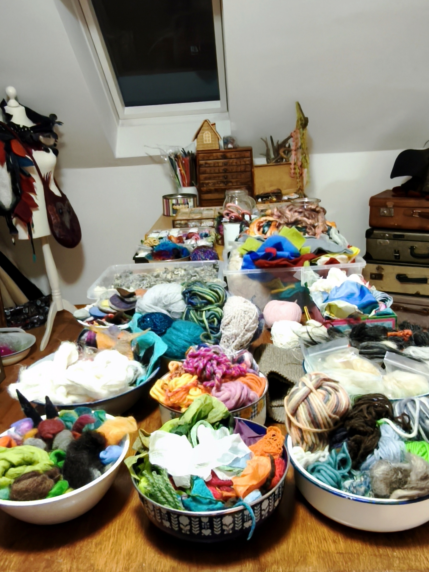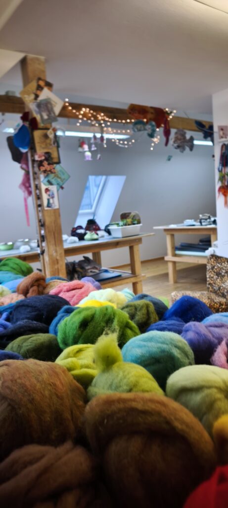 Die Werkstatt in eine bunte Farbenpracht voller Wolle, Seide, Fasern anderer Arten und sonstiger vielfältiger Materialien zu verwandeln war Ingrids und meine geliebte Aufgabe am Vorabend unseres gemeinsamen Tageskurs „Filzgefäß“.