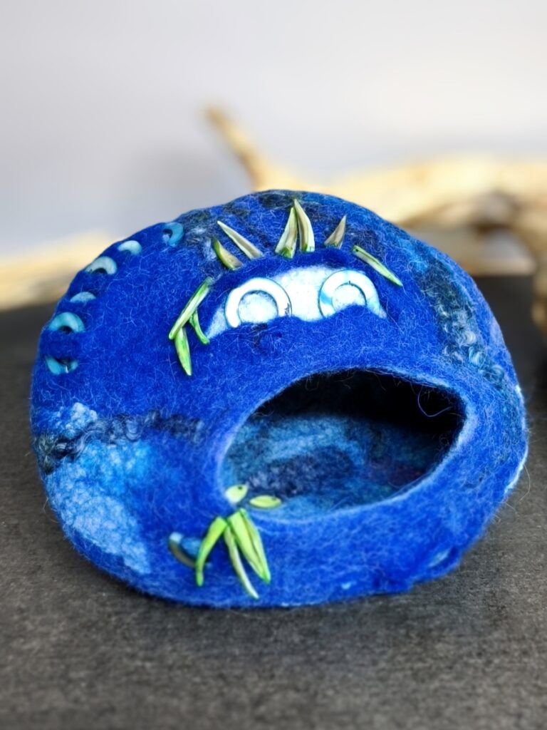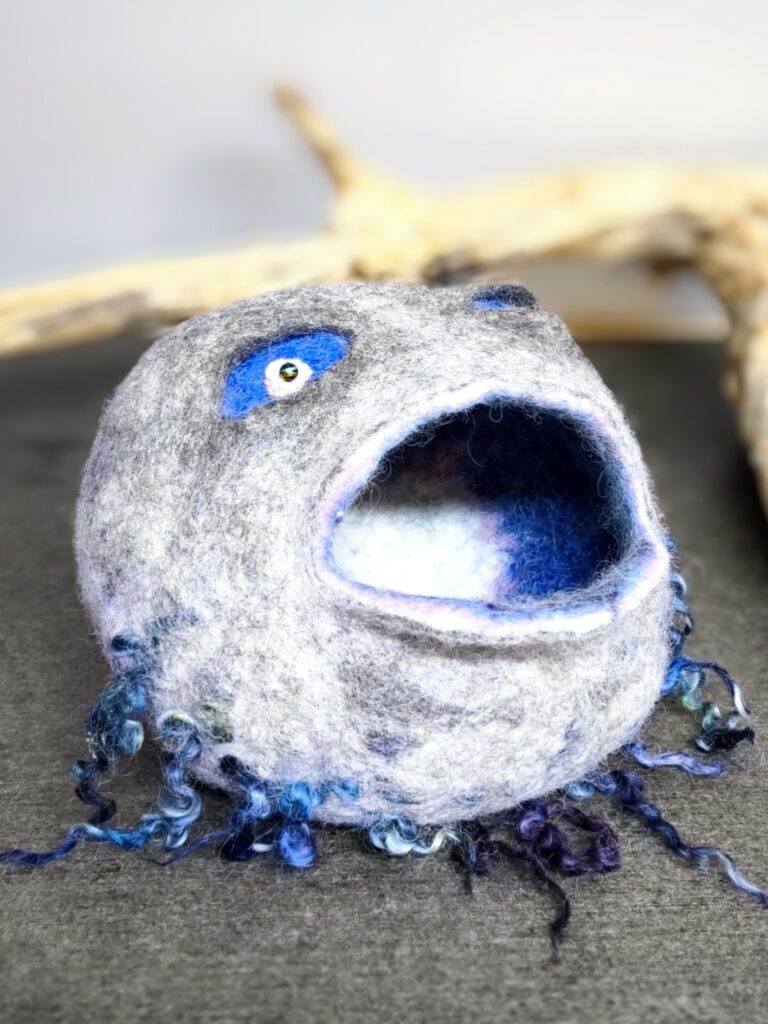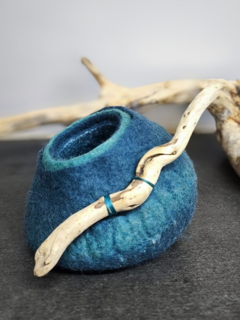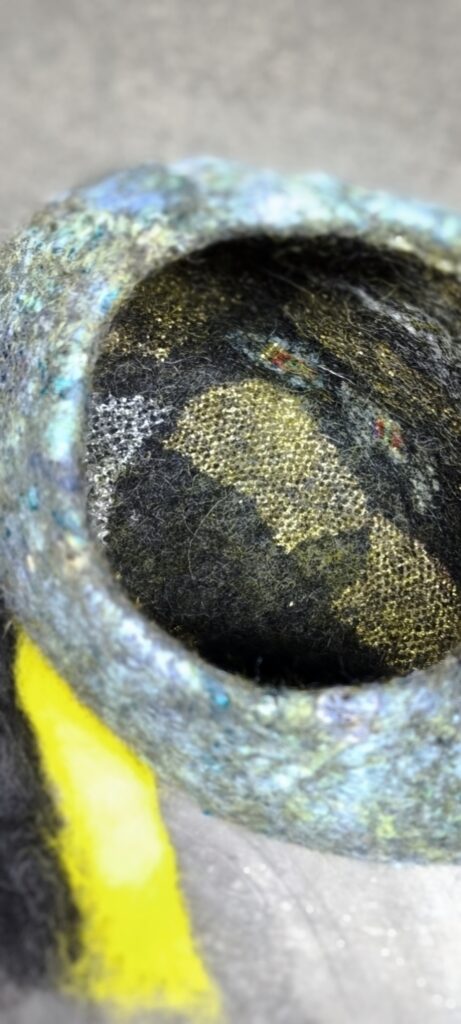 Im Innen und im Außen – jedes Gefäß zeigt beide Ansichten. Mag sein, dass das ein oder andere Gespräch im Raum auch mal vom Innen erzählt hat oder warum gerade diese Farbe oder Textur eine Rolle spielen darf. Das alles hatte Platz – aber nichts musste zwangsläufig formuliert werden. Was von Grund auf verband war das gemeinsame Wolle legen, das Entscheidungen treffen, das sanfte Anfilzen, das kraftvolle Walken und das beherzte und flexible Form finden, die schaffende Gemeinschaft mit dem Ohr und immer einem gutem Wort für die andere.