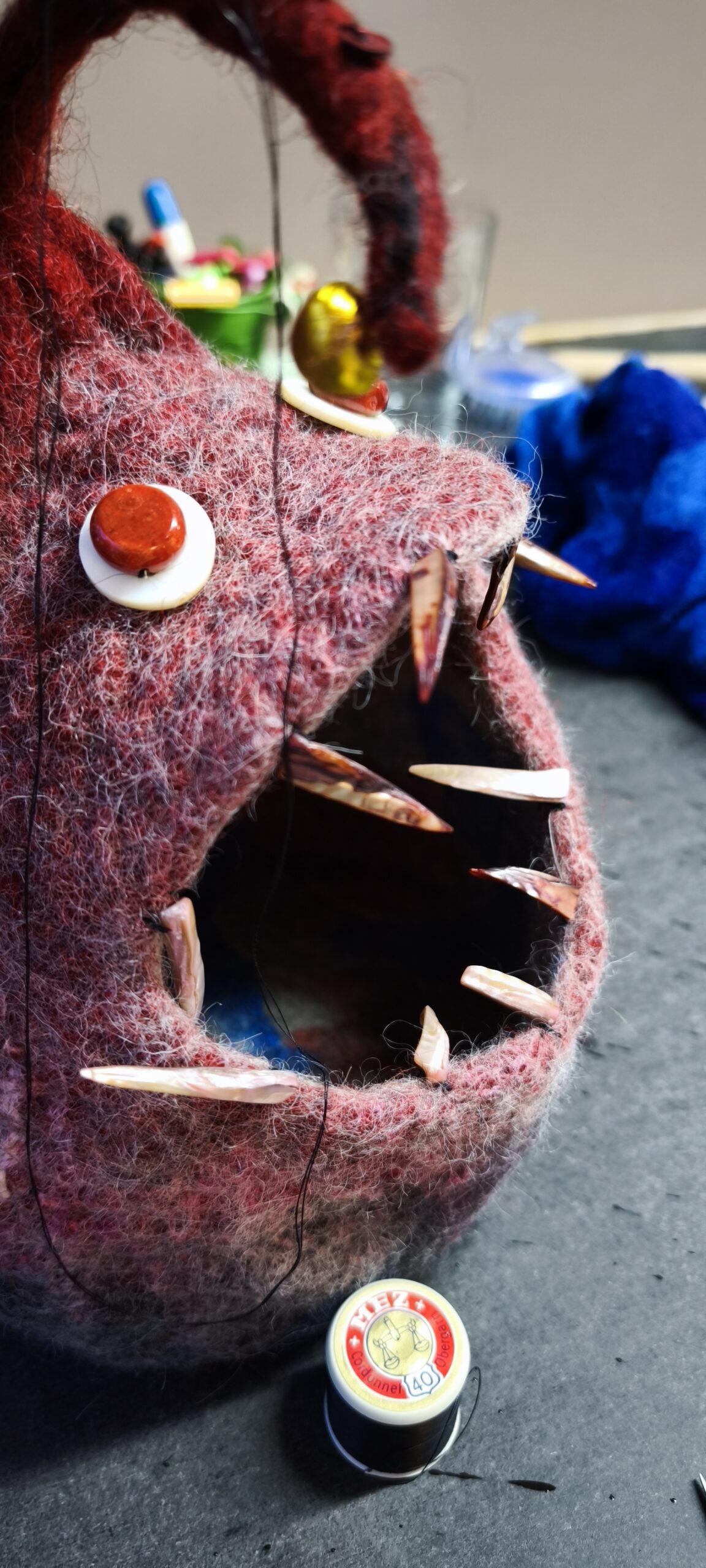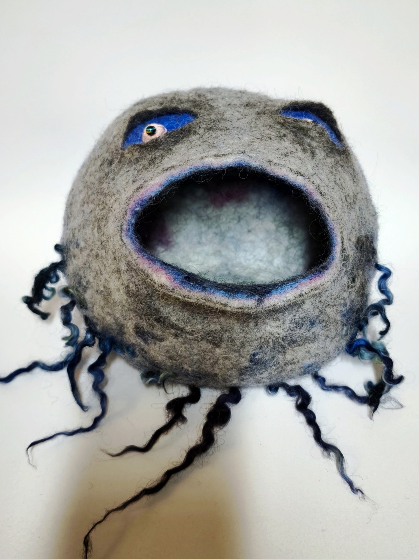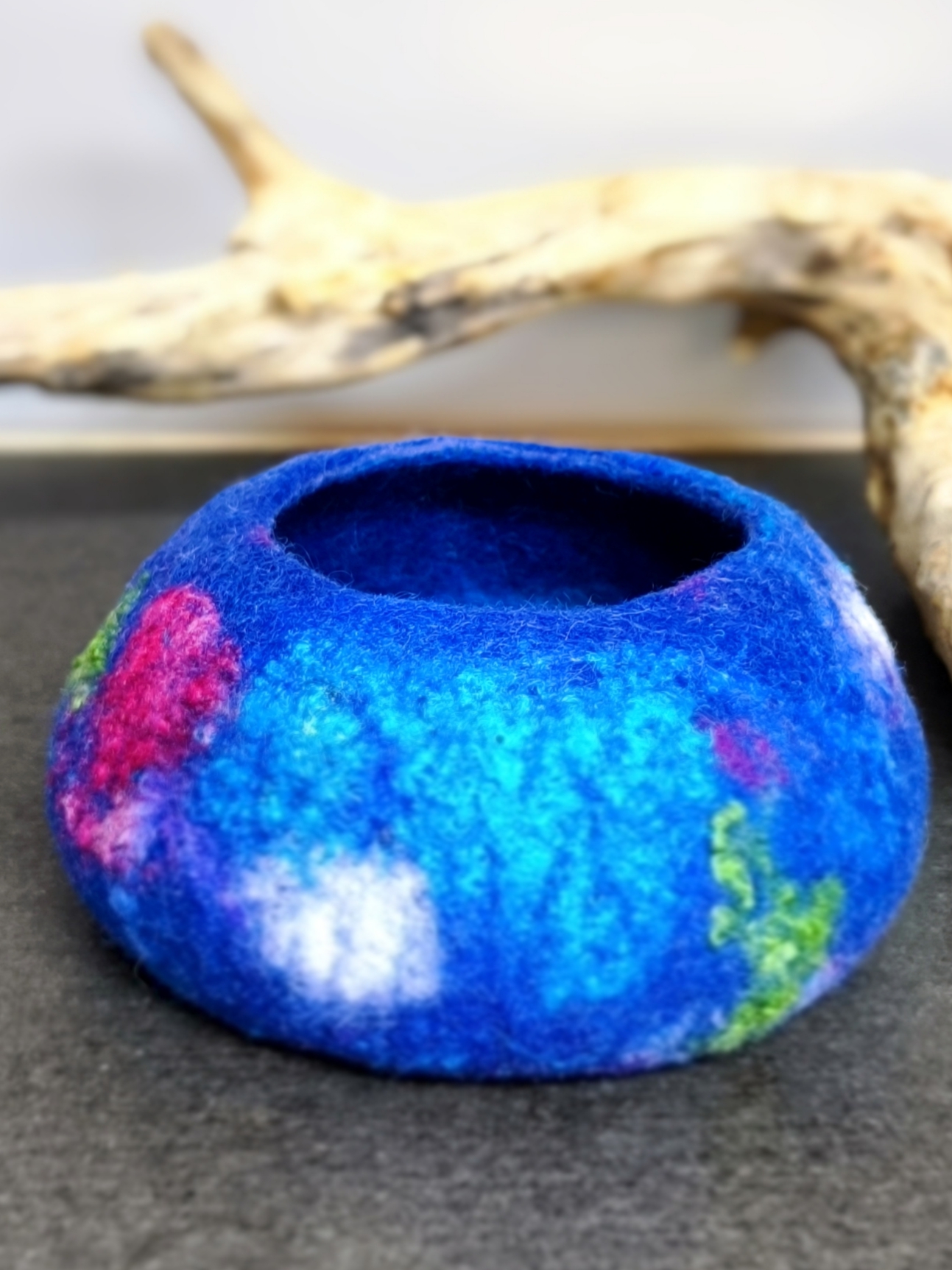 Im Innen und im Außen – jedes Gefäß zeigt beide Ansichten. Mag sein, dass das ein oder andere Gespräch im Raum auch mal vom Innen erzählt hat oder warum gerade diese Farbe oder Textur eine Rolle spielen darf. Das alles hatte Platz – aber nichts musste zwangsläufig formuliert werden. Was von Grund auf verband war das gemeinsame Wolle legen, das Entscheidungen treffen, das sanfte Anfilzen, das kraftvolle Walken und das beherzte und flexible Form finden, die schaffende Gemeinschaft mit dem Ohr und immer einem gutem Wort für die andere.