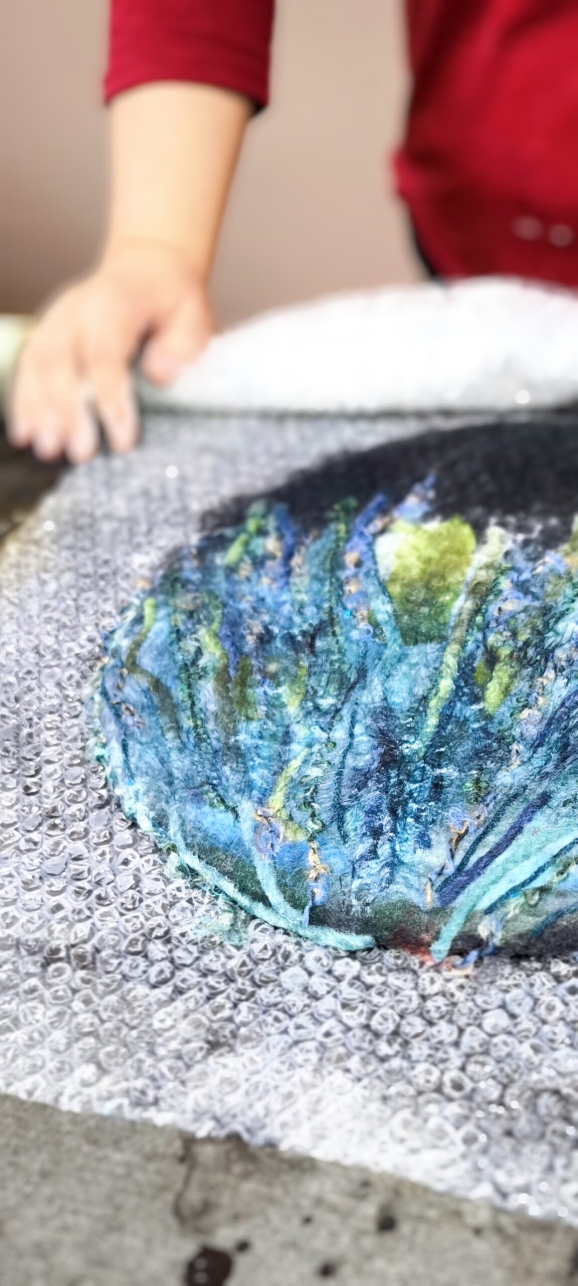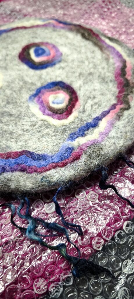 Anfängerinnen im Filzhandwerk wie Geübte – sie alle bildeten für diesen Tag eine Gemeinschaft der Gestaltenden an meinen Tischen, begleitet von Ingrid Modlmayr, Filzgestalterin und Kunsttherapeutin ( Erlangen) und von mir.