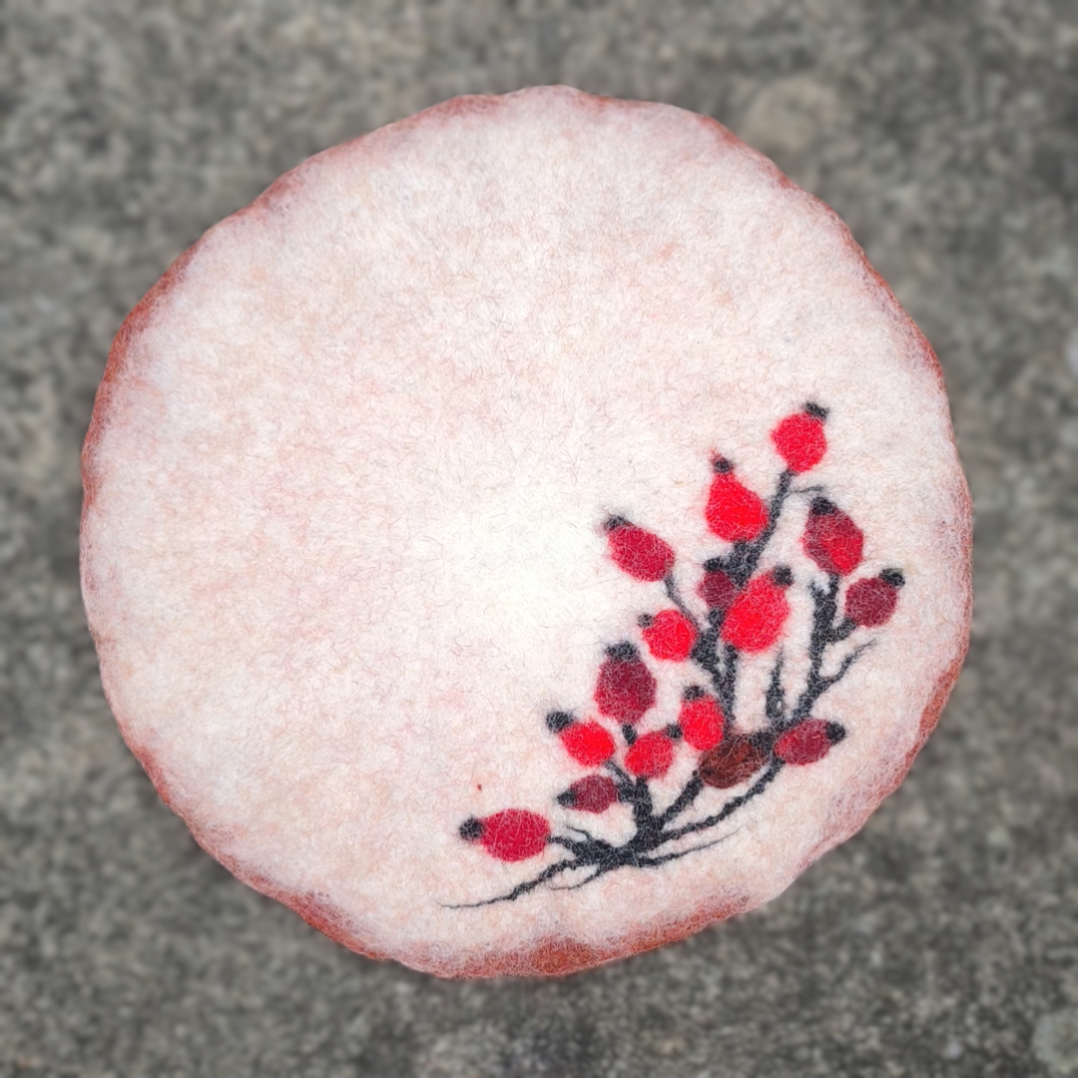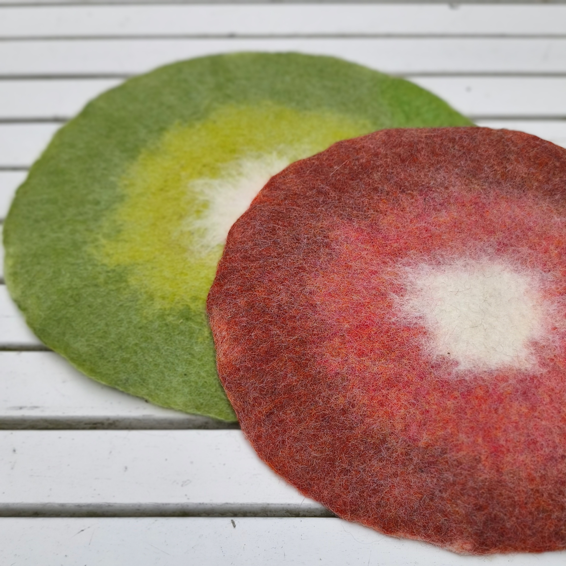 Ob dieser Untersetzer künftig den Tisch schmücken, Vase oder Teekanne den Platz weisen oder als Spielfläche für diverse Figuren eingesetzt wird, bleibt ganz der Phantasie der einzelnen Filzerin überlassen. Ich habe in Erwartung der Erntezeit bereits einige Fruchtmotive in Wolle gefasst – nur als Beispiel und zur Inspiration, denn möglich ist nahezu alles.