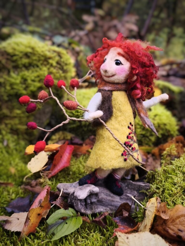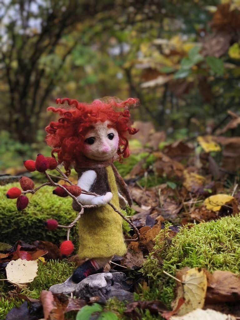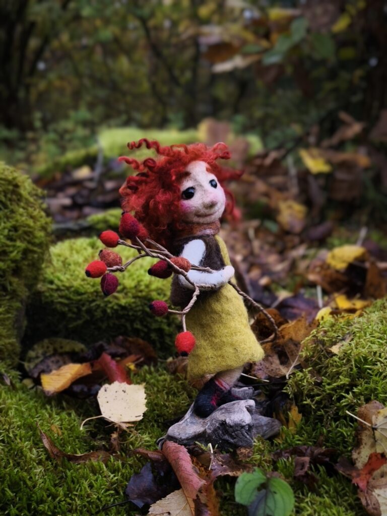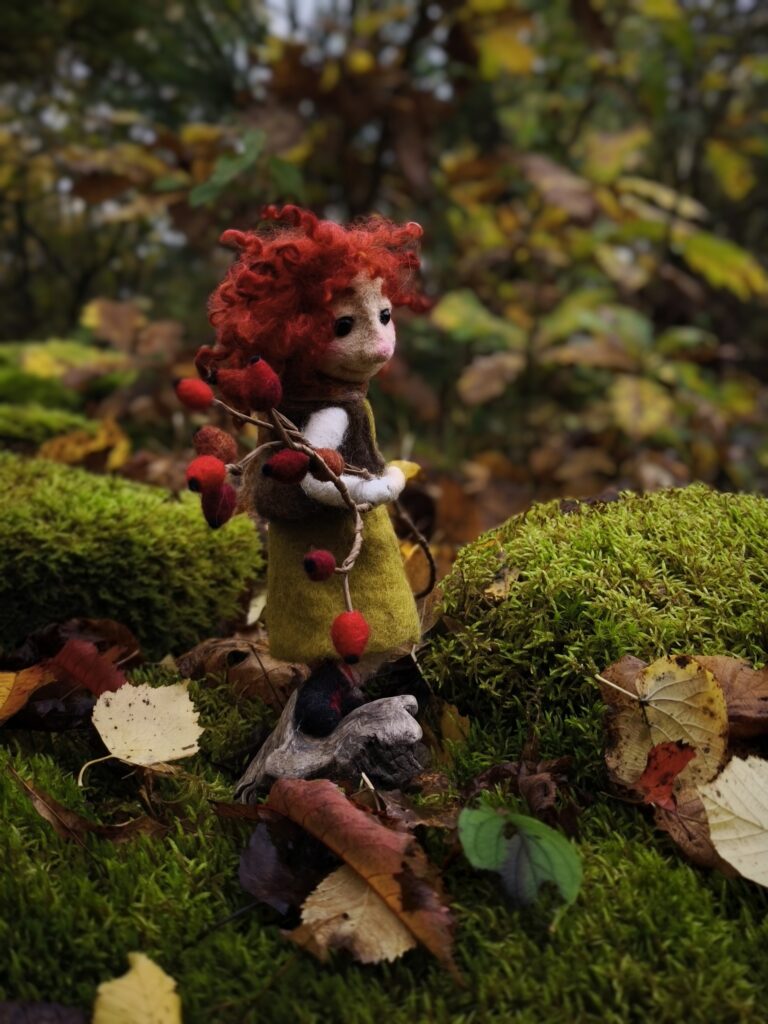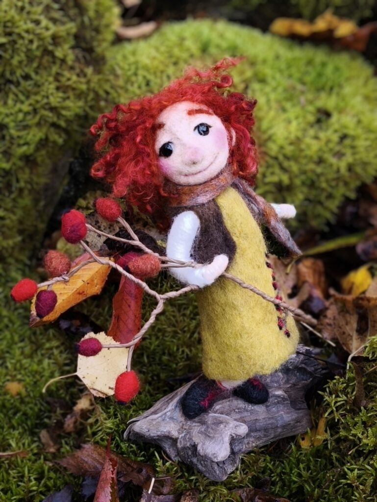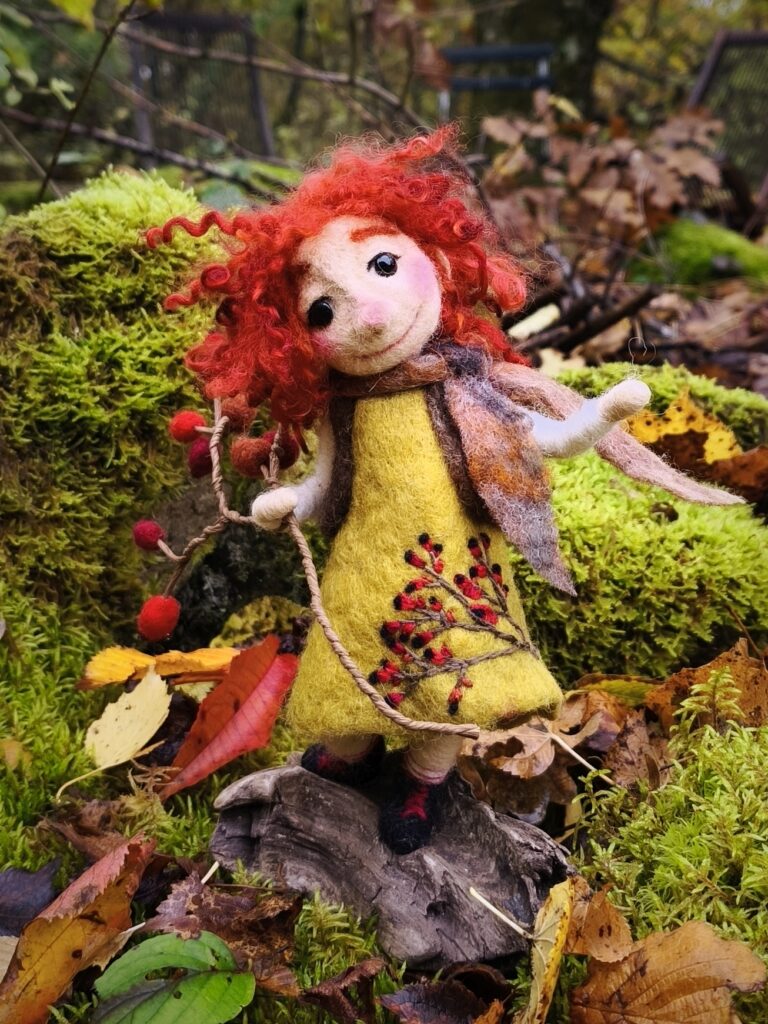 Diese kleine Herbstleuchtenfigur ist aus Bergschafwolle nadelgefilzt, ihre Kleidung ist nassgefilzt. Das Kleidchen ist zudem mit Johanniskraut gefärbt und anschließend bestickt.