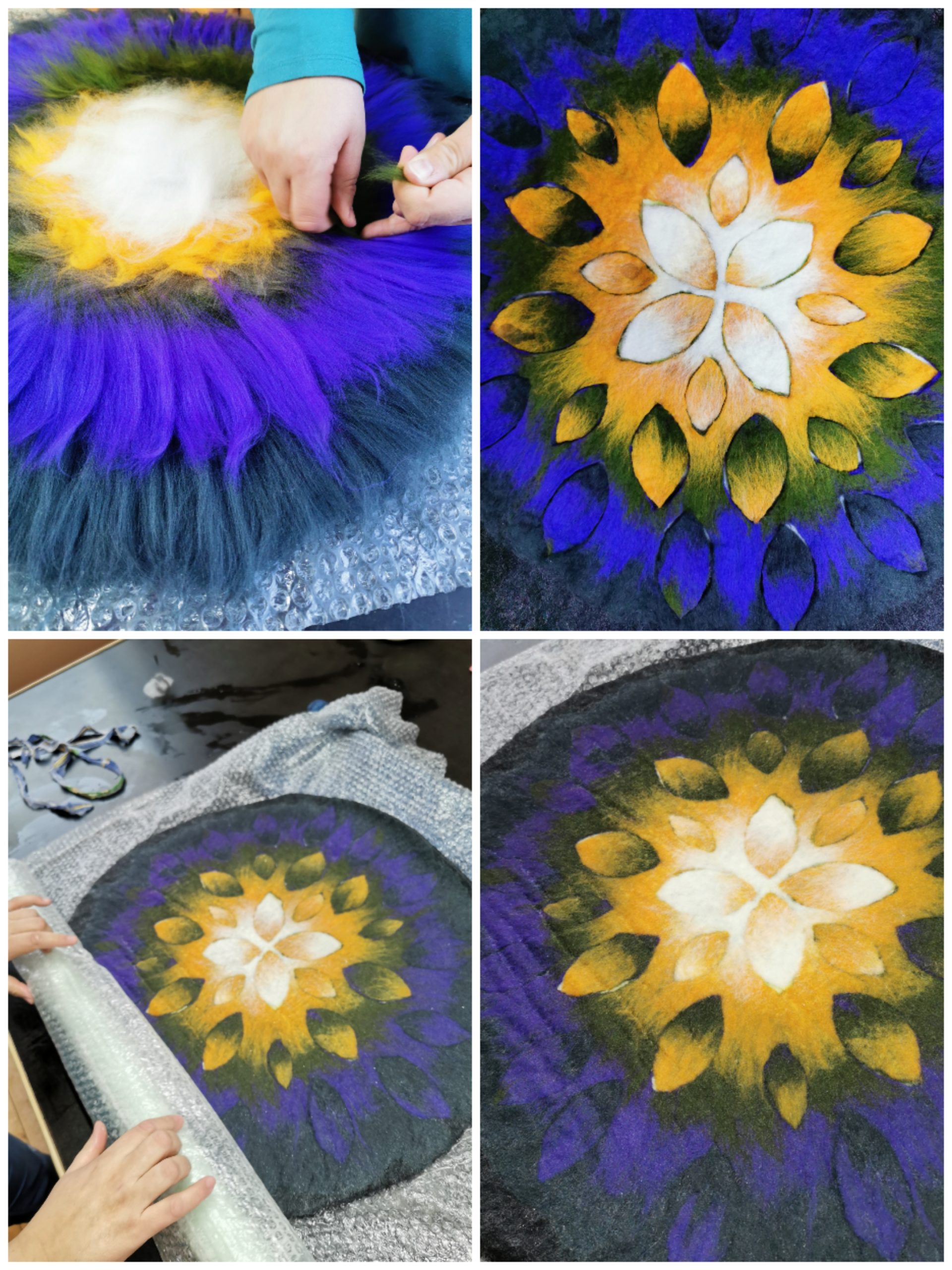 Dicke durchgefilzte Kissensitze in traditioneller Nassfilztechnik entstanden im März in der Landvolkshochschule Niederalteich. Hier durfte ich eine Gruppe Filzanfängerinnen in die verschiedenen Schritte der handwerklichen Filzgestaltung einführen.